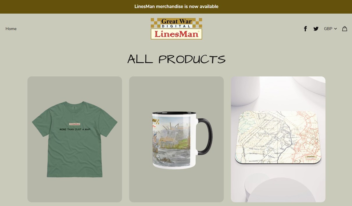 After customer feedback on the ideas for other LinesMan products, we have launched an online shop where you can buy Great War Digital items from Cups to Notebooks and T-Shirts to Hats. More items will be available later which will feature some of our favourite images and trench maps of the First World War.